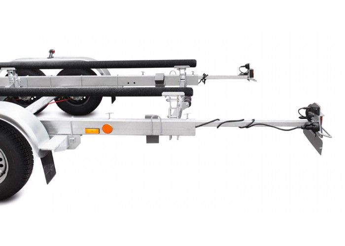 ● Съёмные выдвижные кронштейны с задними габаритными фонарями, исключают погружение светотехники воду и обеспечивают её сохранность. Для соблюдения требований ПДД, при перевозке судна выступающего за габариты прицепа, задние фонари могут быть выдвинуты на 1 метр. Жгут электропроводки убран в защитный гофрированный кожух. Штекер 7-pin.