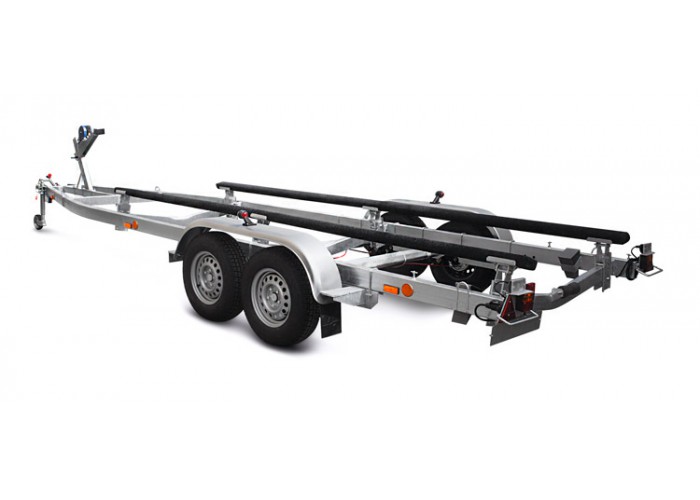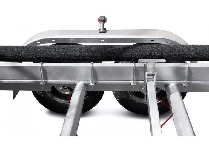 ● Усиленные оцинкованные рама и дышло прицепа выполнены из замкнутого профиля, имеют большой запас прочности и позволяют уберечь жгут электропроводки от внешних повреждений по все длине прицепа. Рама оборудована подножками (4 шт.), петлями крепления груза (4 шт.), отсеками для противооткатных упоров и вспомогательным килевым роликом установленным на задней поперечине прицепа, который обеспечивает свободное скольжение киля при подъёме судна.